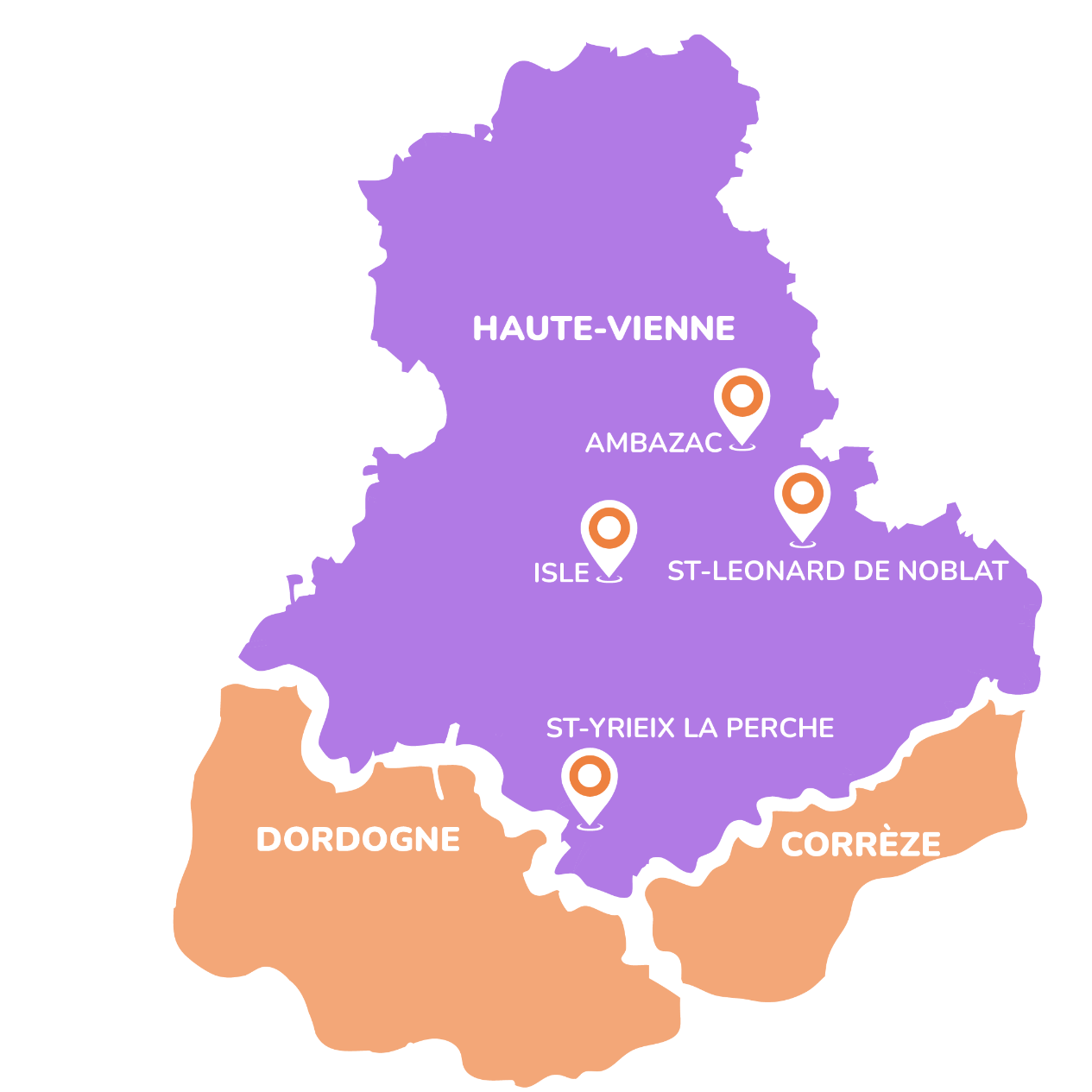 Retrouvez nous à Saint-Yrieix La Perche, Isle, Saint-Léonard de Noblat et Ambazac.